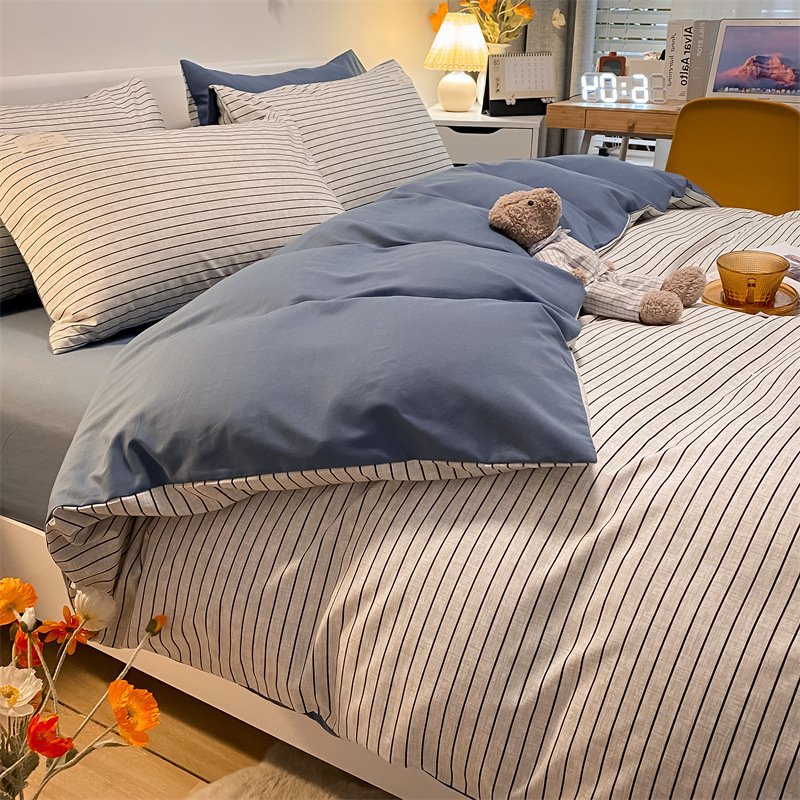 Pure Color Washed Cotton Four-piece Set Of Plaid Striped Sheets Quilt Cover Bedding